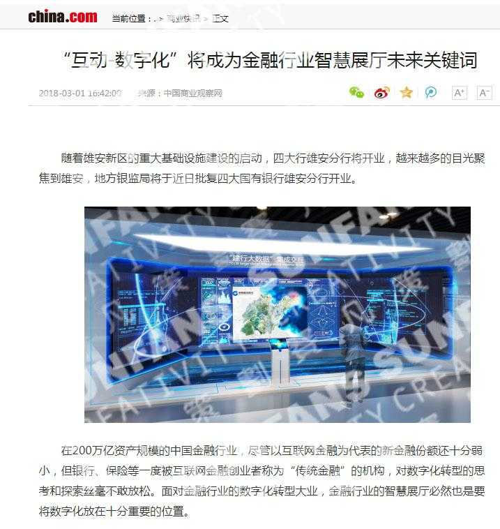 赛凡多年来在展厅设计建造方面,一直坚持以“作品”为核心,用作品说话的初心,深耕于金融、核电行业多年。日前,中华网、凤凰网等各大门户网站相继刊登了一篇名为《“互动-数字化”将成为金融行业智慧展厅未来关键词》的文章。