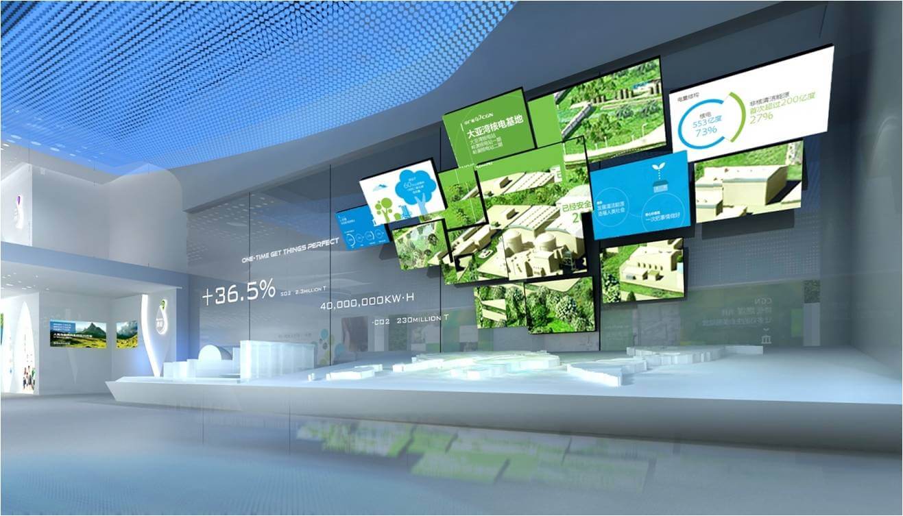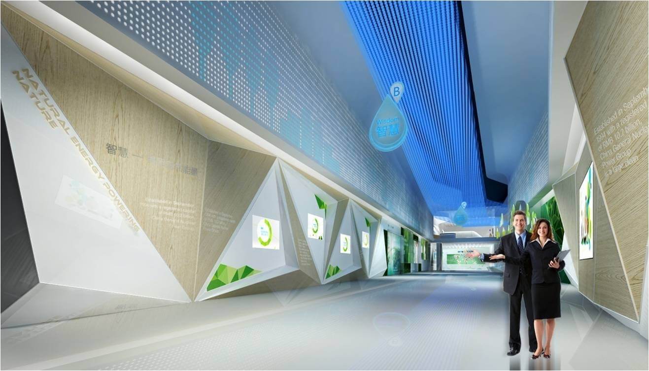大亚湾基地展厅设计属于长廊型空间,设计鉴于核电产业绿色循环、临海建设的特点,在简约的空间格调中,引入蓝、绿两个点缀色调,增加现代气息。