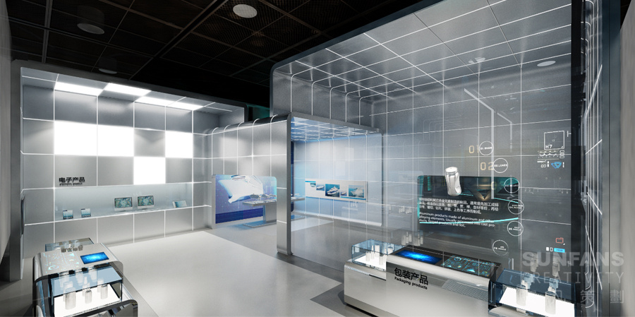 以“三维分子结构”为创意来源,分子与分子的链接,恰如铝业生产链中一环扣一环,产生集聚效应。将分子剖切形成多组看面,从铝土矿到电解铝,从锻造到中厚板,以视频展示每个环节的工艺流程。