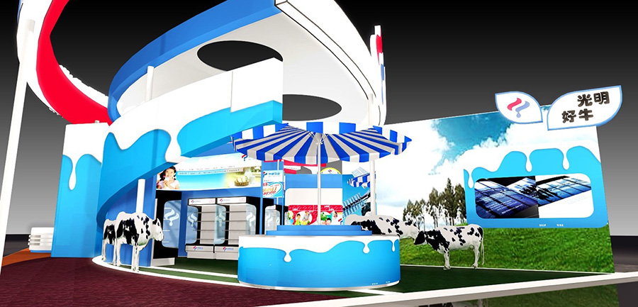 积极响应环保理念,采用可回收建材与模块化结构,减少现场废弃物。整体设计以乳白色与自然绿为主色调,融入生态元素,呼应光明乳业在低碳环保与可持续发展方面的企业责任。