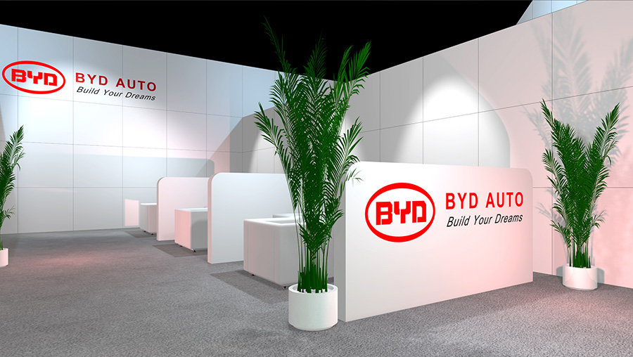 国际化视觉体系构建:将比亚迪品牌的全球化视觉元素与车展特性相结合,设计具备高辨识度与视觉张力的主体形象结构。