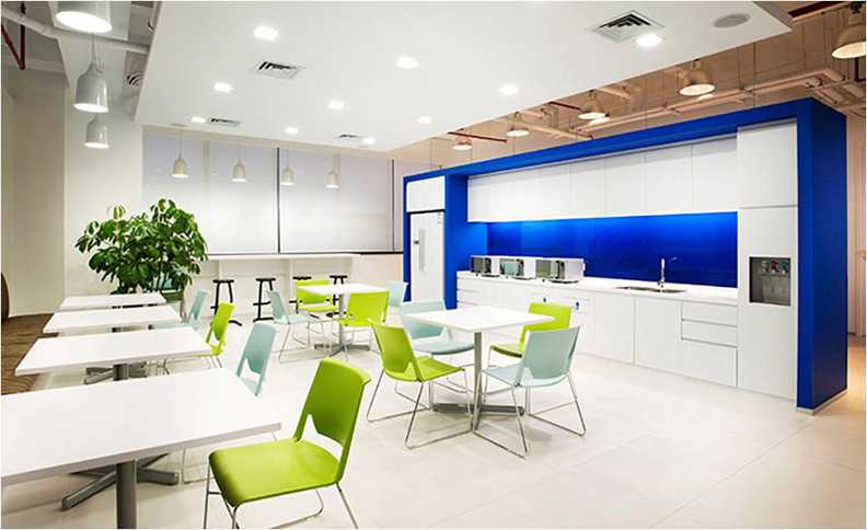 明亮的休息室整体以白色与蓝色为主,为员工打造一种安静、舒服的休息环境。现代化的桌椅与墙体的颜色保持一致,这都可以让员工可以产生愉快的心情。明快的色调也起到了增添室内采光的效果,达到更好的生机的视觉效果。