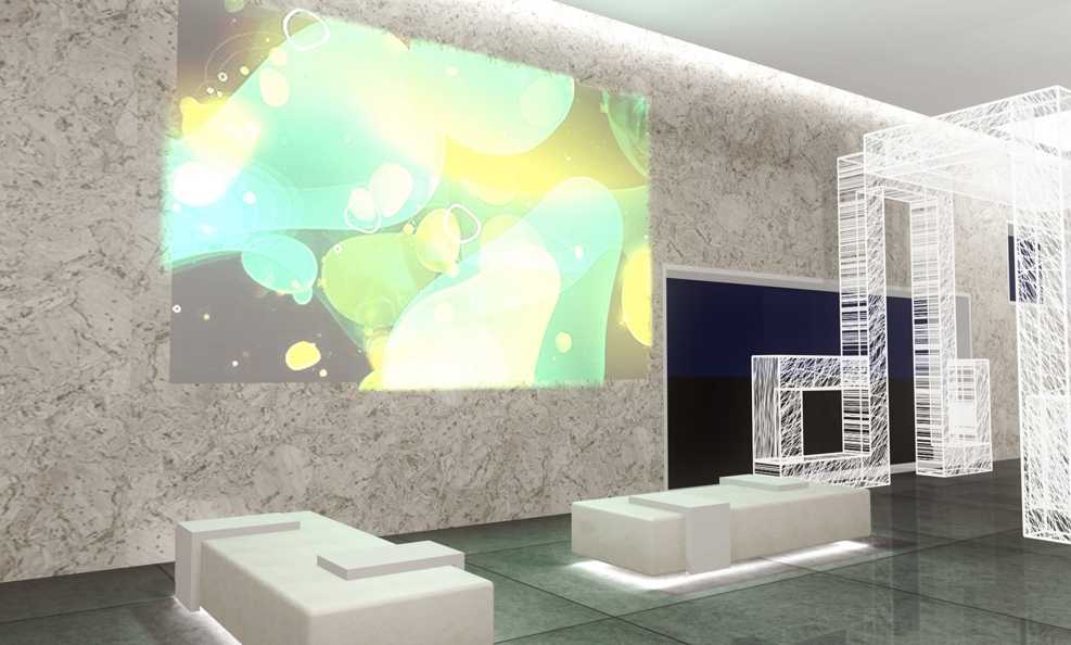 展台的上方是垂吊着的光纤,细腻而柔软,会随着重力垂将下来,尾端自然的微微卷曲,像简单勾勒出的美人的发。吊顶的上方藏有光纤发射器,届时光会顺着总长度达五千米、数量为一千九百余条的光纤滑落,在展厅的上方组成一片仿佛因时间停止而未来得及洒落的雨幕。光纤本身是没有颜色属性的,被给予什么颜色,就会显现成什么颜色。由此变得梦幻、变得未知、变得生动。