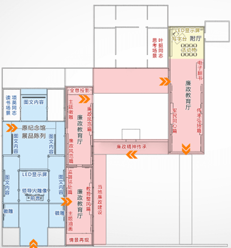 参观线路:参观路线设定从教育馆的正门入口进入,顺时针依次参观雕像、LED屏幕、原纪念馆展品、廉政教育厅和廉政精神传承、当地廉政建设等内容。